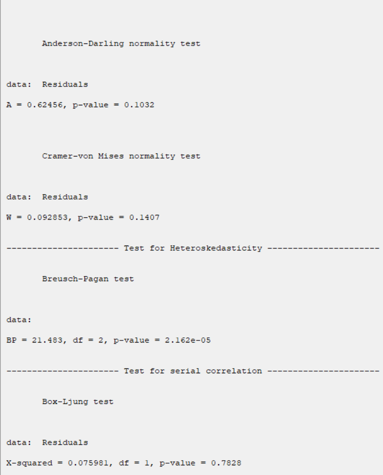 The results show that in all tests, the P-value is greater than 0.05 (Except in Heteroskedasticity,